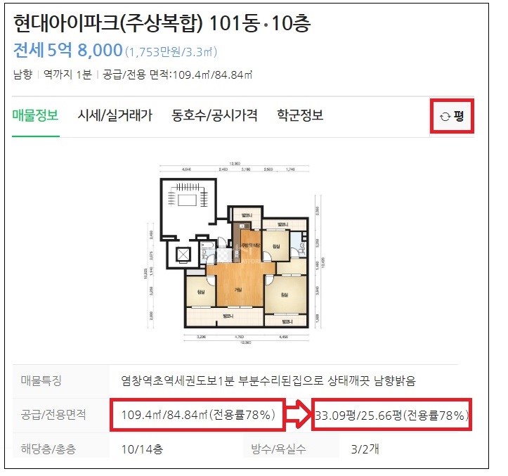 우선 법정 단위 자체를 제곱미터(㎡)로 정했기 때문에 부동산 모든 매물의 면적은 ㎡로 표시됩니다. 그런데 사실 자세하게 알 필요는 없습니다. 우리가 궁금한 건 평수입니다. 제일 쉬운 건 소수점을 생각하지 않고 ㎡에 0.3를 곱하거나 3.3을 나누면 됩니다.