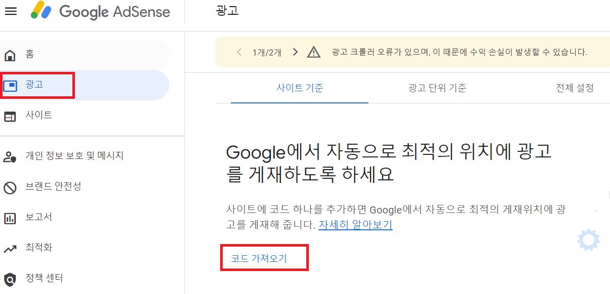 가장 먼저 구글 애드센스 사이트에서 광고 코드를 복사합니다. 광고를 클릭하고 [코드 가져오기]를 누른 후 [코드 복사]를 누르면 복사가 됩니다.